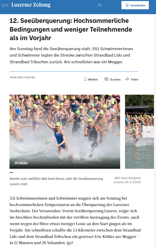 Geschrieben am 27. August 2023. Seeüberquerung Luzern in der Luzerner Zeitung Link zum Online-Artikel der Luzerner Zeitung vom 20.08.2023 Link zur Bildergalerie von Christian Arnet im Auftrag des Vereins Seeüberquerung Luzern Link zur Homepage des Vereins Seeüberquerung Luzern Link zu den Ranglisten Seeüberquerung Luzern 2023 Zurück Weiter